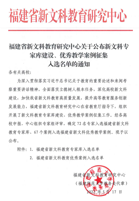 福建省新文科教育研究中心在省教育厅指导下,深入贯彻落实习近平总书记关于教育的重要论述和来闽考察重要讲话精神,全面落实立德树人根本任务,深化高校新文科建设,加快我省新文科教育高质量发展,提升高等教育服务创新发展能力,组织开展了新文科教育专家库建设、优秀教学案例征集工作。经各高校申报、中心组织专家组评审,确定72名专家入选福建省新文科教育专家库、67个案例入选福建省新文科优秀教学案例。