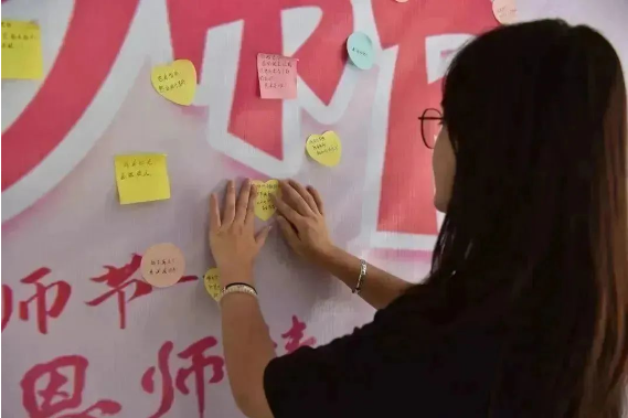 校团委举办以“莘莘学子心,难忘恩师情”为主题庆祝教师节活动。在主题展板上,一张张写满祝福的便利贴,表达着同学们对老师们沉甸甸的爱意和浓浓的感恩。