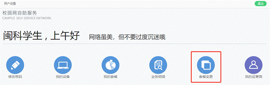 (3)自助服务页面,点击“套餐变更”,弹出页面显示默认套餐为校园网,点击“变更当前套餐”,勾选刚绑定的运营商名称,依次点击“下一步”“确定”