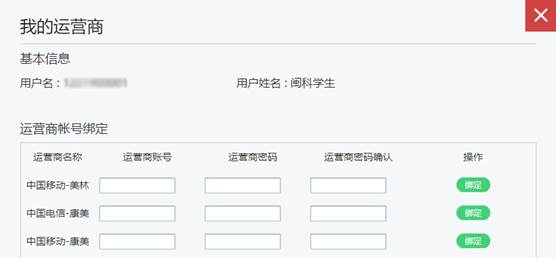 (2)登录校园网自助服务网站后,点击“我的运营商”,在弹出页面,找到对应运营商,从左往右依次输入“运营商账号”“运营商密码”“运营商密码确认”,点击“绑定”即可将运营商账号绑定在校园网账号上。(提示:运营商账号即运营商提供的宽带账号,一般为手机号码或以0595开头的0595XXXXXXX格式账号。绑定账号选择运营商时注意看有区分康美校区和美林校区,如:中国电信-康美,中国电信-美林,中国移动-康美,中国移动-美林等)