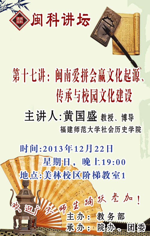 讲座题目: 闽南爱拼会赢文化起源,传承与校园文化建设